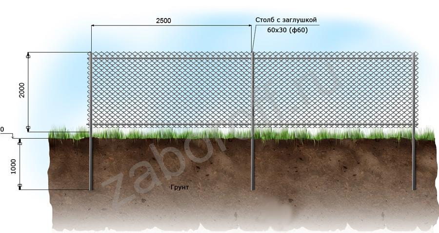 В зависимости от типа почвы установка столба в грунт производится на глубину 1200 мм посредством забивки, бетонирования или бутования мелким щебнем фракции 5-20 мм.Для этого в заранее пробуренный шурф диаметром 200 мм вставляется столб и послойно трамбуется щебенкой. Данный способ подходит для всех типов грунтов, в том числе дляболотистых местностей, а также для участков с большой ветровой нагрузкой.Установка рабицы