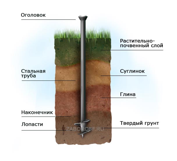 Винтовая свая за счет острого наконечника и спиральных лопастей прочно входит в землю, проходя сквозь мягкие и пучинистые слои