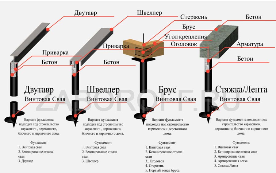 После установки свай под фундамент в соответствие с планом свайного поля, в зависимости от типа здания/строения, происходит их обвязка швеллером, двутавром, брусом или бетонной стяжкой.